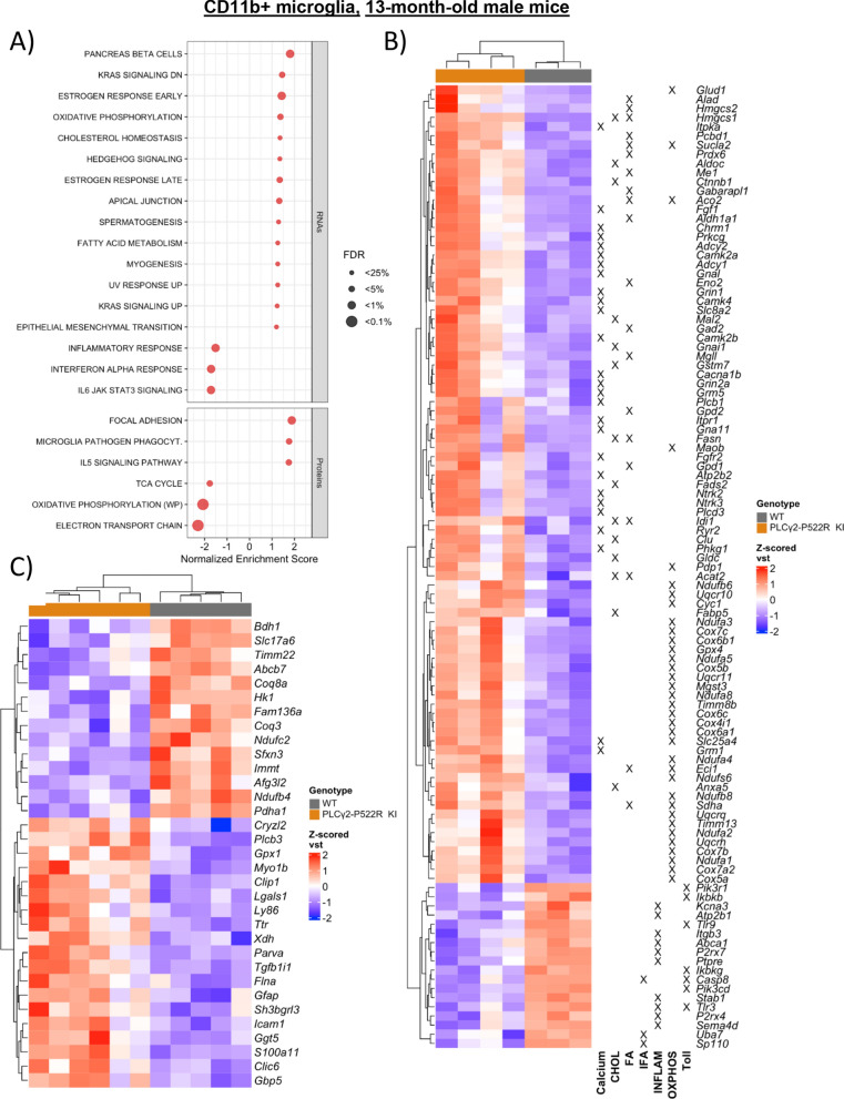 Conclusions: These findings suggest that the PLCγ2-P522R variant exerts protective effects against β-amyloid and neuronal pathologies by increasing microglial responsiveness to β-amyloid plaques in APP/PS1 mice. The changes observed in lipid/fatty acid and mitochondrial metabolism revealed by the omics and metabolic assessments of mouse and human microglial models suggest that the protective effects of the PLCγ2-P522R variant are potentially associated with increased metabolic capacity of microglia.