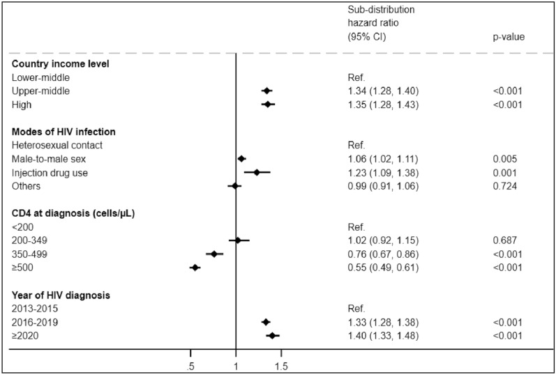 Results: Among 14,968 participants, most were male (70.1%), with a median age of 36 years (interquartile range [IQR]: 28-44). At HIV diagnosis, median CD4 count was 208 cells/µL (IQR: 69-395), and median viral load was 86,296 copies/mL (IQR: 13,186-392,000). Over 85% of participants had initiated ART during the study period. Median time from HIV diagnosis to ART initiation differed across years of HIV diagnosis: 51 days (2013-2015), 28 days (2016-2019), and 26 days (≥ 2020). Factors associated with shorter time to ART initiation were higher country income-level (upper-middle: sub-distribution hazard ratio [SHR] = 1.34, 95% CI: 1.28, 1.40; high: SHR = 1.35, 95% CI: 1.28, 1.43; vs. lower-middle); HIV transmission via male-to-male contact (SHR = 1.06, 95% CI: 1.02, 1.11) or injection drug use (SHR = 1.23, 95% CI: 1.09, 1.38; vs. heterosexual contact); and later years of HIV diagnosis (2016-2019: SHR = 1.33, 95% CI: 1.28, 1.38; ≥ 2020: SHR = 1.40, 95% CI: 1.33, 1.48; vs. 2013-2015). Those with higher CD4 counts had longer time to ART start (350-499 cells/µL: SHR = 0.76, 95% CI: 0.67, 0.86; > 500 cells/µL: SHR = 0.55, 95% CI: 0.49, 0.61; vs. CD4 < 200 cells/µL).