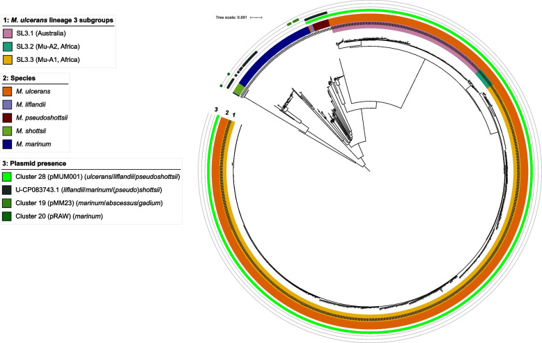 Methods: We used publicly available complete genome sequence data of 328 NTM isolates belonging to 125 species to study gene content, genomic diversity, and clusters of 196 annotated NTM plasmids. Furthermore, we analyzed 3755 draft genome assemblies from over 200 NTM species and 5415 short-read sequence datasets from six clinically relevant NTM species or complexes including M. abscessus, M. avium complex, M. ulcerans complex and M. kansasii complex, for the presence of these plasmids.