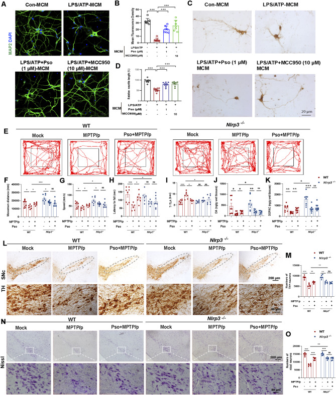 Results: Psoralen treatment improved PD-like symptoms and reduced dopaminergic neuronal death by targeting glial NLRP3 inflammasome activation in the MPTP/p mouse model. By performing 4D label-free quantitative phosphorylation proteomics and site mutation assays, we identified that Psoralen prevents NLRP3 phosphorylation at Serine 658 by binding to its NACHT and LRR domains.