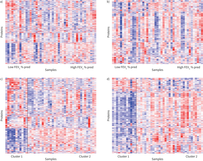 Methods: We performed tandem mass tagging and mass spectrometry (MS) analysis on bronchoalveolar lavage fluid samples from persons living with HIV with OLD (n=26) and without OLD (n=26). We combined untargeted MS with a targeted SomaScan aptamer-based approach. We used Pearson correlation tests to identify associations between each protein and lung function (forced expiratory volume in 1 s (FEV1) % pred). We adjusted for multiple comparisons using a false discovery rate adjustment. Significant proteins were entered into a pathway over-representation analysis. Protein-driven endotypes were constructed using K-means clustering.