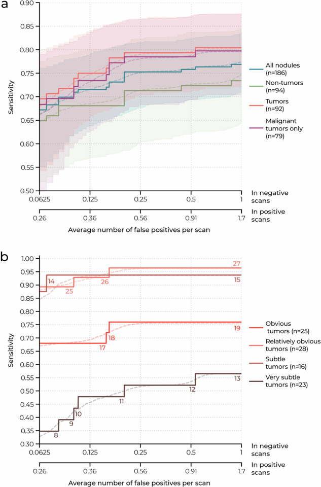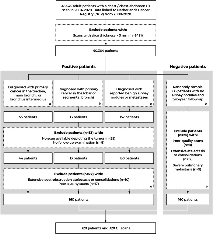 Results: We identified 160 patients with airway nodules (median age of 64 years [IQR: 54-70], 58 women) and added a random sample of 160 patients without airway nodules (median age of 60 years [IQR: 48-69], 80 women). The sensitivity of the AI system was 75.1% (95% CI: 67.6-81.6%) for detecting all nodules with an average number of false positives per scan of 0.25 in negative patients and 0.56 in positive patients. At the same operating point, the sensitivity was 79.0% (95% CI: 70.4-86.6%) for the subset of tumors. A subgroup analysis showed that the system detected the majority of subtle tumors.