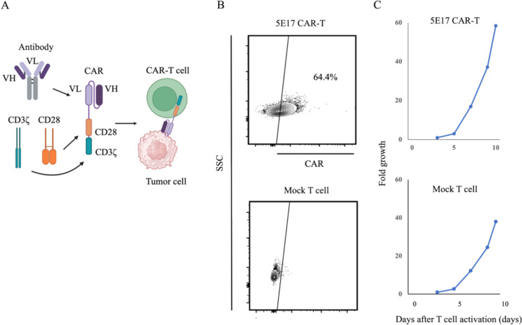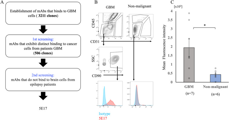 Results: Approximately 3,200 clones were established. Among them, 5E17 reacted with tumor cells in six of seven patients with GBM, but not with nonmalignant human brain cells. Prostaglandin F2 receptor negative regulator (PTGFRN) was identified as an antigen recognized by 5E17. CAR-T cells derived from 5E17 produced cytokines and exerted cytotoxicity upon co-culture with tumor cells from patients with GBM. Furthermore, intracranial injection of 5E17-CAR-T cells demonstrated antitumor effects in an orthotopic xenograft murine model with patient-derived GBM cells.
