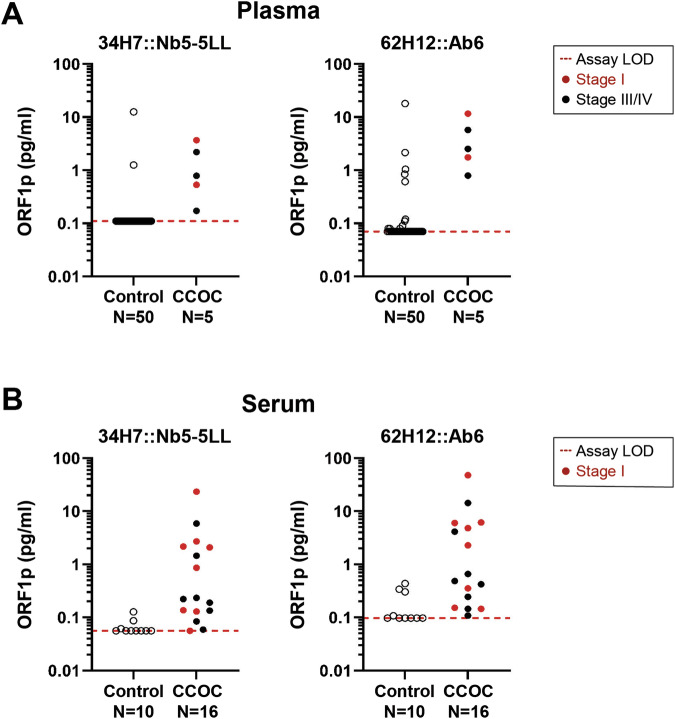Long interspersed element 1 (LINE-1) retrotransposons are repetitive sequences that can move within the genome by an autonomous mechanism. To limit their mutagenic potential, benign cells restrict LINE-1 expression through molecular mechanisms such as DNA methylation and histone modification, but these mechanisms are usually impaired in cancer. Clear cell ovarian carcinoma (CCOC) represents 5-10% of ovarian cancers and is thought to arise from endometriosis. Women with advanced CCOC face poor prognoses, highlighting the importance of understanding early disease pathogenesis. In our study, 33 of 40 cases (over 82%) of CCOC tumors express ORF1p, a LINE-1-encoded protein. We found that LINE-1 de-repression is an early event in CCOC, as ORF1p is enhanced during the transition from typical to atypical endometriosis and persists in invasive cancer. Finally, using single-molecule array (Simoa) assays, we detected ORF1p in patient blood, suggesting it as a potential minimally invasive biomarker for this disease.