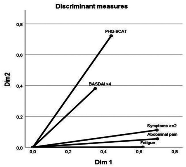 Methods: Cross-sectional study, which included SpA patients from two rheumatology outpatient clinics. Patients were assessed for GI, and depressive symptoms (PHQ-9), perceived stress (PSS-10), disease activity (ASDAS, BASDAI) and functionality (BASFI). Laboratory tests included C-reactive protein (CRP), erythrocyte sedimentation rate (ESR), fecal calprotectin, and Secretory IgA. Statistical analysis involved Spearman correlation, linear regression, and multiple correspondence discriminant analysis (MCDA).