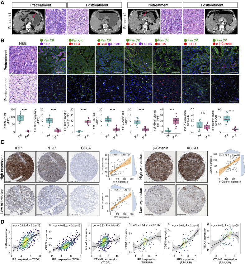 Immune checkpoint blockade (ICB) therapies have achieved significant breakthroughs in cancer treatment over the past decade. However, ICB is largely ineffective in desert-type gastric cancer due to intrinsic tumor heterogeneity and a highly immunosuppressive tumor microenvironment (TME). Transforming tumors from an immunosuppressive state to an immunostimulatory state is a potential approach to enhance ICB response. In this study, we developed a chromosomal instability-subtype gastric cancer mouse model with an immunoactive TME and a stem cell-originated mouse-derived allograft model with an immunosuppressed TME to investigate mechanisms regulating the tumor immunophenotype and uncover therapeutic strategies to remodel the TME. Blocking β-catenin signaling attenuated the immunochemotherapeutic resistance of mouse-derived allograft tumors. The tyrosine kinase inhibitor apatinib reprogrammed the TME by increasing CD8+ T-cell and IGHA+ plasma cell infiltration and decreasing M2 macrophages, but apatinib also induced PD-L1 and CD80 expression in both human and mouse desert-type tumors. Oxaliplatin decreased the apatinib-induced expression of immune checkpoints and enhanced the antitumor efficacy of immunotherapy. A prospective clinical trial (NCT04195828) demonstrated that a neoadjuvant regimen of apatinib plus ICB and chemotherapy was effective in patients with desert-type gastric cancer. Collectively, these findings identify potential drug targets for immune desert-type gastric cancer driven by β-catenin signaling. Significance: Apatinib combined with oxaliplatin reprograms the tumor immune microenvironment in desert-type gastric cancer, enhancing the efficacy of immune checkpoint blockade and paving the way for optimized combination immunotherapeutic strategies.
