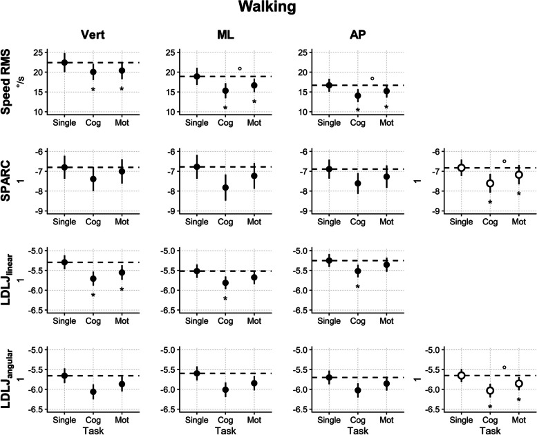 Results: In straight-walking and turning, cognitive and motor dual tasks decreased gait speed (ES range = [0.476, 1.379]; p < 0.01) and increased the step number (ES = [0.402, 0.927]; p < 0.05). SPARC (ES = [0.221, 0.493]; p < 0.05) and angular LDLJ (ES = [0.451, 0.929]; p < 0.01) were lower in the two dual-task conditions in both phases, indicating reduced gait smoothness than in single-task. This worsening of gait smoothness was partially confirmed after ruling out the dual-task effect on speed and step number. In particular, anterior-posterior SPARC during turning was still low in cognitive (ES = 0.351; p < 0.01) and motor (ES = 0.283; p < 0.05) dual tasks.