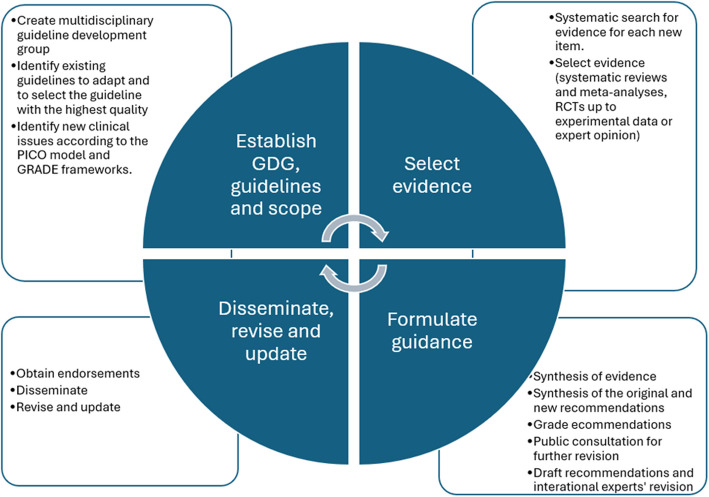 Guideline development process. PICO model: Population, Intervention, Comparison and Outcomes model; GDG: Guideline Development Group; GRADE frameworks: Grading of Recommendations Assessment, Development and Evaluation Evidence to Decision frameworks; RCTs: randomized controlled trials