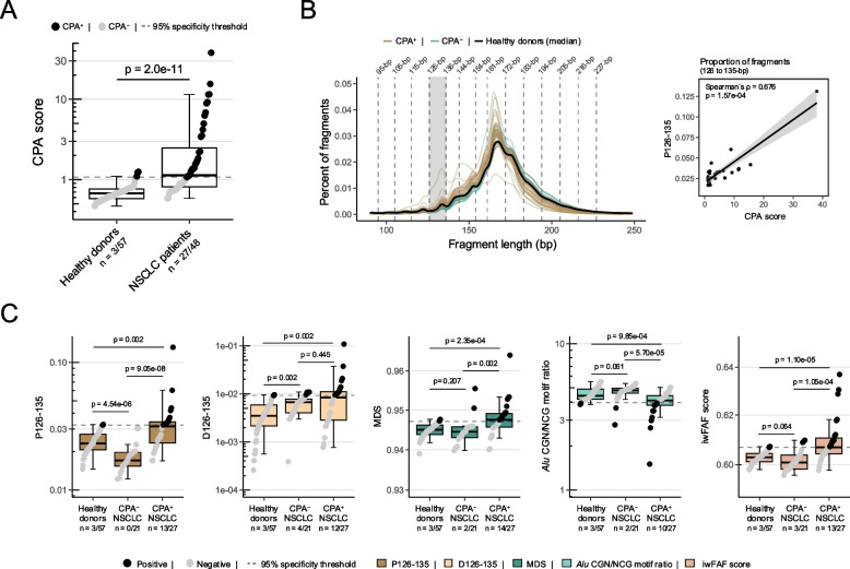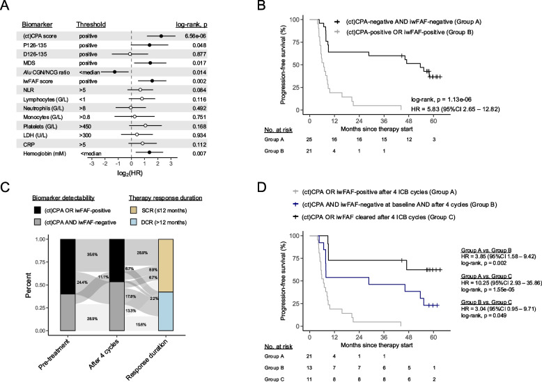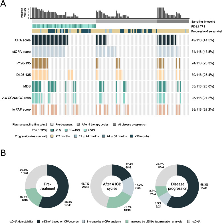 Findings: Fragmentation features and CNVs were complementary indicators, whose combination significantly increased ctDNA detection compared to single-marker assessments (+ 20.3% compared to CNV analysis alone). Baseline fragment length alterations, but not CNVs, were significantly associated with subsequent progression-free survival (PFS; hazard ratio [HR] = 4.10, p = 6.58e-05) and could improve PFS predictions based on tumor PD-L1 expression alone (HR = 2.70, p = 0.019). Residual CNVs or aberrant fragmentation of ctDNA under ongoing therapy could stratify patients according to the subsequent response duration (median 5.8 vs. 47.0 months, p = 1.13e-06). The integrative analysis of ctDNA fragment characteristics at baseline, tumor PD-L1 expression, and residual ctDNA under ongoing treatment constituted the strongest independent predictor of PFS (p = 6.25e-05) and overall survival (p = 1.3e-03) in multivariable analyses along with other clinicopathologic variables.