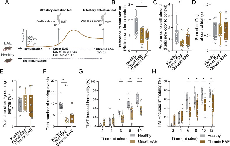 Background: Olfactory dysfunction is an underestimated symptom in multiple sclerosis (MS). Here, we examined the pathogenic mechanisms underlying inflammation-induced dysfunction of the olfactory bulb using the animal model of MS, experimental autoimmune encephalomyelitis (EAE).