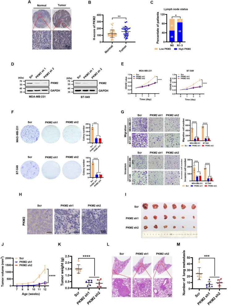 Background: Emerging evidence has revealed that PKM2 has oncogenic functions independent of its canonical pyruvate kinase activity, serving as a protein kinase that regulates gene expression. However, the mechanism by which PKM2, as a histone kinase, regulates the transcription of genes involved in triple-negative breast cancer (TNBC) metastasis remains poorly understood.