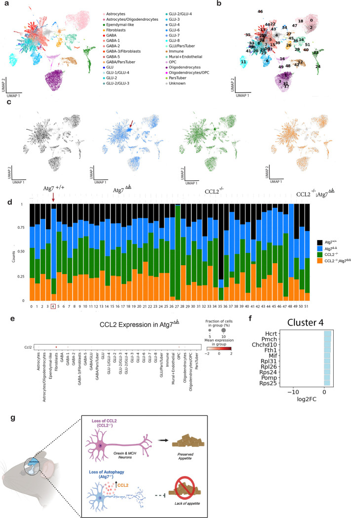 Macroautophagy (autophagy hereafter) captures intracellular components and delivers them to lysosomes for degradation and recycling1. In adult mice, autophagy sustains metabolism to prevent wasting by cachexia and to survive fasting, and also suppresses inflammation, liver steatosis, neurodegeneration, and lethality2,3. Defects in autophagy contribute to metabolic, inflammatory and degenerative diseases, however, the specific mechanisms involved were unclear 4. Here we profiled metabolism and inflammation in adult mice with conditional, whole-body deficiency in an essential autophagy gene and found that autophagy deficiency altered fuel usage, and reduced ambulatory activity, energy expenditure, and food intake, and elevated circulating GDF15, CXCL10, and CCL2. While deletion of Gdf15 or Cxcl10 provided no or mild benefit, deletion of Ccl2 restored food intake, suppressed cachexia and rescued lethality of autophagy-deficient mice. To test if appetite suppression by CCL2 was responsible for lethal cachexia we performed single nucleus RNA sequencing of the hypothalamus, the center of appetite control in the brain. Notably, we found that autophagy deficiency was specifically toxic to PMCH and HCRT neurons that produce orexigenic neuropeptides that promote food intake, which was rescued by deficiency in CCL2. Finally, the restoration of food intake via leptin deficiency prevented lethal cachexia in autophagy-deficient mice. Our findings demonstrate a novel mechanism where autophagy prevents induction of a cachexia factor, CCL2, which damages neurons that maintain appetite, the destruction of which may be central to degenerative wasting conditions.