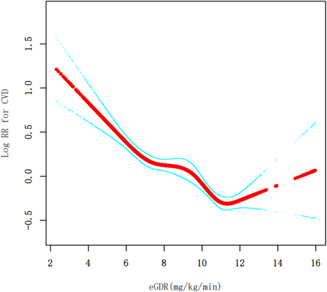 Results: During a mean follow-up of 8.29 ± 1.67 years, among 7,849 participants (mean age 62.4 ± 8.7 years; 52.82% male), 1,946 CVD events occurred, including 1,504 cardiac events and 663 strokes. CKM stages 0-3 comprised 492 (6.27%), 1,404 (17.89%), 5,462 (69.59%), and 491 (6.26%) of participants, respectively. A U-shaped relationship between eGDR and CVD risk was identified (turning point: 11.82 mg/kg/min). Below this turning point, each unit increase in eGDR decreased CVD risk by 12% (HR: 0.88, 95% CI: 0.86-0.90, P < 0.0001); above it, each unit increase raised the risk by 19% (HR: 1.19, 95% CI: 1.04-1.37, P = 0.0135).