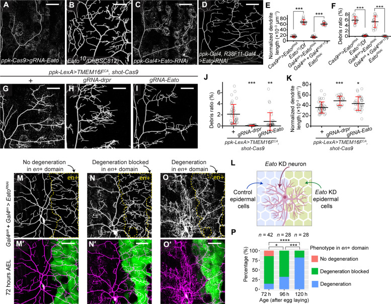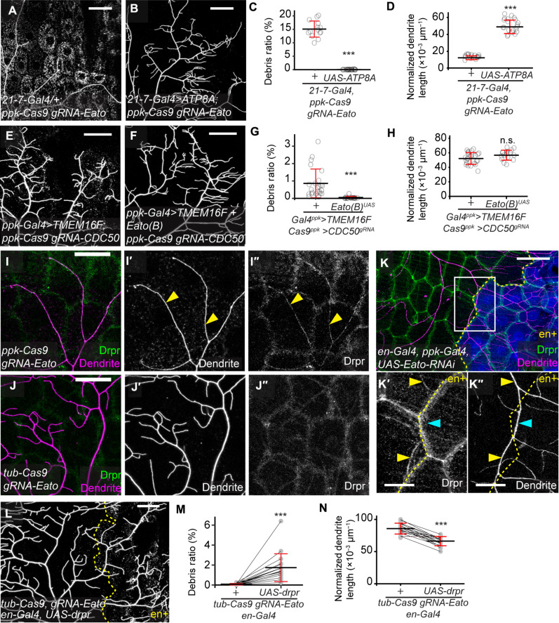 Lipid homeostasis is critical to neuronal survival. ATP-binding cassette A (ABCA) proteins are lipid transporters associated with neurodegenerative diseases. How ABCA transporters regulate lipid homeostasis in neurodegeneration is an outstanding question. Here we report that the Drosophila ABCA protein engulfment ABC transporter in the ovary (Eato) regulates phagocytosis-dependent neurodegeneration by playing opposing roles in neurons and phagocytes: In neurons, Eato prevents dendrites and axons from being attacked by neighboring phagocytes; in phagocytes, Eato sensitizes the cell for detecting neurons as engulfment targets. Thus, Eato deficiency in neurons alone causes phagocytosis-dependent neurite degeneration, but additional Eato loss from phagocytes suppresses the neurite degeneration. Mechanistically, Eato functions by removing the eat-me signal phosphatidylserine from the cell surface in both neurons and phagocytes. Multiple human and worm ABCA homologs can rescue Eato loss in phagocytes but not in neurons, suggesting both conserved and cell type-specific activities of ABCA proteins. These results imply possible mechanisms of neuron-phagocyte interactions in neurodegenerative diseases.