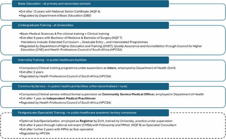 Medical Education (ME) in South Africa has a century long legacy which continues to make a significant impact globally through its graduates. The aim of this paper is to showcase the evolving landscape of ME in South Africa, whiles addressing the legacy of socio-economic and educational disparities influenced by its colonial and Apartheid history. The paper focuses on the effectiveness of recent reforms to create a more equitable and inclusive healthcare education system that can meet the diverse needs of the population and prepare healthcare professionals for challenges in varied and resource-constrained environments. This reflection therefore contributes to setting the scene for the formulation of strategic objects for the future.Key areas explored include widening access and participation through student admission and selection processes designed to promote inclusivity and equity; the development of student and academic support programmes to meet the needs of a diverse student population; the implementation of integrated, outcomes-based curricula; and the decentralisation of clinical training to underserved and rural areas. These measures aim to align medical training with a primary healthcare approach and to foster socially accountable and contextually responsive practitioners equipped to address local health challenges. Indeed, transformative learning experiences are shaping a resilient, agile and competent healthcare workforce.However, this paper additionally identifies persistent challenges, including disparities in resource allocation, gaps in leadership and governance, accreditation and the tension between addressing historical inequities and ensuring robust academic standards. Moreover, the public healthcare system, which serves as the primary training ground for medical students, struggles to balance a quadruple burden of disease and infrastructural deficiencies with education needs.Opportunities for growth are noted in the increasing emphasis on research and scholarship in ME, supported by the creation of a dedicated journal and five departments for medical and health professions education out of the ten medical schools in the country, formalising faculty development and postgraduate qualifications. This highlights the need for expansion of similar approaches in the other medical schools to address the gaps in research and the dearth of skilled clinician-educators.Despite these strides, within the complexity of ongoing challenges, a focus on sustaining and strengthening robust quality assurance, a focus on primary healthcare, and expanding training of students and clinician-educators remains central.