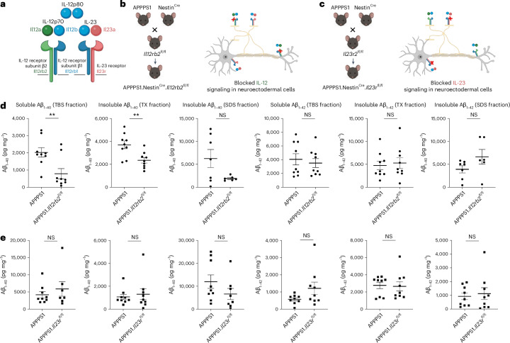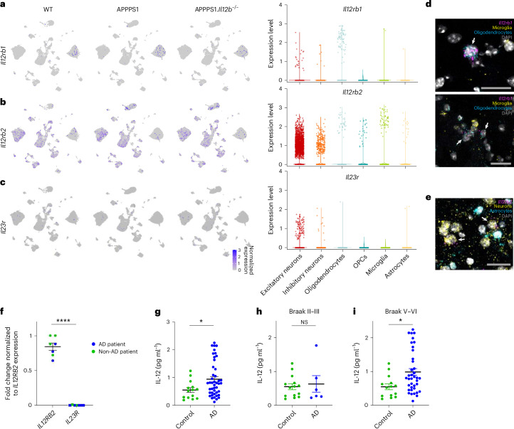 Neuroinflammation including interleukin (IL)-12/IL-23-signaling is central to Alzheimer's disease (AD) pathology. Inhibition of p40, a subunit of IL-12/IL-23, attenuates pathology in AD-like mice; however, its signaling mechanism and expression pattern remained elusive. Here we show that IL-12 receptors are predominantly expressed in neurons and oligodendrocytes in AD-like APPPS1 mice and in patients with AD, whereas IL-23 receptor transcripts are barely detectable. Consistently, deletion of the IL-12 receptor in neuroectodermal cells ameliorated AD pathology in APPPS1 mice, whereas removal of IL-23 receptors had no effect. Genetic ablation of IL-12 signaling alone reverted the loss of mature oligodendrocytes, restored myelin homeostasis, rescued the amyloid-β-dependent reduction of parvalbumin-positive interneurons and restored phagocytosis-related changes in microglia of APPPS1 mice. Furthermore, IL-12 protein expression was increased in human AD brains compared to healthy age-matched controls, and human oligodendrocyte-like cells responded profoundly to IL-12 stimulation. We conclude that oligodendroglial and neuronal IL-12 signaling, but not IL-23 signaling, are key in orchestrating AD-related neuroimmune crosstalk and that IL-12 represents an attractive therapeutic target in AD.