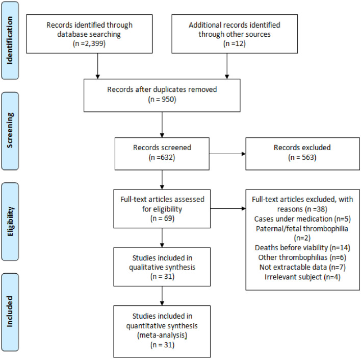 Purpose: The association between inherited thrombophilias and stillbirth has been long investigated but the estimated risk remains unknown. The aim of our study is to summarize available data on the effect of Factor V Leiden, Prothrombin G20210A and MTHFR mutation, Protein S, Protein C and Anithrombin deficiency on the prevalence of stillbirth.