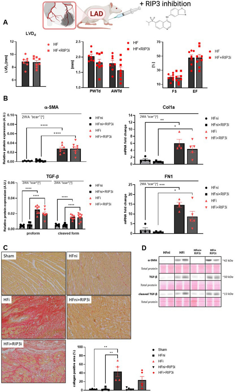 Since cell dying in heart failure (HF) may vary based on the aetiology, we examined the main forms of regulated necrosis, such as necroptosis and pyroptosis, in the hearts damaged due to myocardial infarction (MI) or pressure overload. We also investigated the effects of a drug inhibiting RIP3, a proposed convergent point for both these necrosis-like cell death modes. In rat hearts, left ventricular function, remodelling, pro-cell death, and pro-inflammatory events were investigated, and the pharmacodynamic action of RIP3 inhibitor (GSK'872) was assessed. Regardless of the HF aetiology, the heart cells were dying due to necroptosis, albeit the upstream signals may be different. Pyroptosis was observed only in post-MI HF. The dysregulated miRNAs in post-MI hearts were accompanied by higher levels of a predicted target, HMGB1, its receptors (TLRs), as well as the exacerbation of inflammation likely originating from macrophages. The RIP3 inhibitor suppressed necroptosis, unlike pyroptosis, normalised the dysregulated miRNAs and tended to decrease collagen content and affect macrophage infiltration without affecting cardiac function or structure. The drug also mitigated the local heart inflammation and normalised the higher circulating HMGB1 in rats with post-MI HF. Elevated serum levels of HMGB1 were also detected in HF patients and positively correlated with C-reactive protein, highlighting pro-inflammatory axis. In conclusion, in MI-, but not pressure overload-induced HF, both necroptosis and pyroptosis operate and might underlie HF pathogenesis. The RIP3-targeting pharmacological intervention might protect the heart by preventing pro-death and pro-inflammatory mechanisms, however, additional strategies targeting multiple pro-death pathways may exhibit greater cardioprotection.