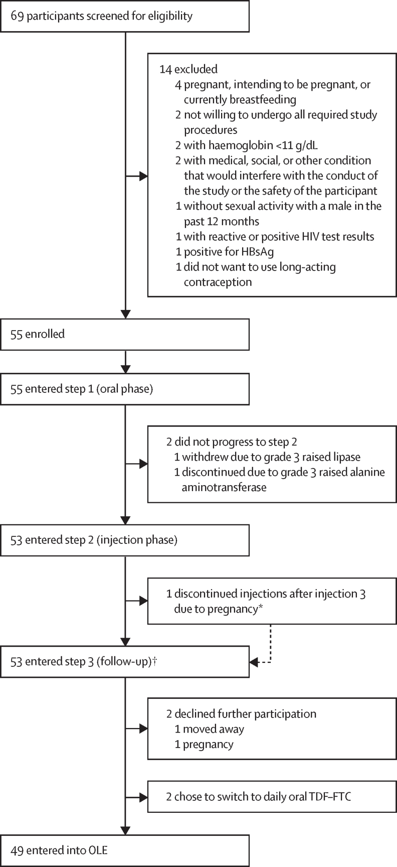 Findings: Between Nov 1, 2020, and Aug 31, 2021, 69 participants were assessed for eligibility and 55 met inclusion criteria. The mean age was 16·0 years (SD 1·1), 39 (71%) had a recent primary sexual partner, 12 (22%) reported transactional sex, and 22 (40%) had sexually transmitted infections at baseline. Two participants dropped out and did not initiate long-acting injectable cabotegravir due to adverse events unrelated to the study drug during the oral lead-in. One participant stopped long-acting injectable cabotegravir after three injections due to pregnancy. 51 (93%) participants reported at least one adverse event of grade 2 or higher, mostly unrelated, transient laboratory abnormalities. There were no long-acting injectable cabotegravir discontinuations due to intolerability. Of the 52 participants who completed step 2, all scheduled injections were completed and 32 (62%) participants reported they would consider using long-acting injectable cabotegravir for HIV prevention in the future.