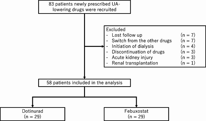 Although hyperuricemia is associated with chronic kidney disease (CKD), the impact of uric acid (UA)-lowering drugs on CKD has been controversial. Previous investigations have primarily included xanthine oxidase inhibitors; therefore, research of dotinurad, a recently developed selective urate reabsorption inhibitor, is necessary. This retrospective study included 58 patients with CKD; of these, 29 newly initiated dotinurad and 29 initiated febuxostat. The effects of dotinurad and febuxostat on the serum UA, urinary UA-to-creatinine ratio (UUCR), and estimated glomerular filtration rate (eGFR) during 3 months were analyzed to compare their impacts on renal function. Dotinurad and febuxostat decreased serum UA (8.40 ± 1.11 to 6.50 ± 0.80 mg/dL [p < 0.001] and 8.91 ± 1.21 to 6.05 ± 1.28 mg/dL [p = < 0.001], respectively). The UUCR increased after dotinurad (0.35 ± 0.15 to 0.40 ± 0.21 g/gCr [p = 0.024]); however, it decreased after febuxostat (0.33 ± 0.12 to 0.21 ± 0.06 g/gCr [p = 0.002]). The eGFR improved after dotinurad (33.9 ± 15.2 to 36.2 ± 15.9 mL/min/1.73 m2 [p < 0.001]). No change was observed after febuxostat treatment (33.4 ± 19.6 to 34.1 ± 21.6 mL/min/1.73 m2). Renal function improved only with dotinurad, thus highlighting its renoprotective effects beyond the reduction of serum UA.