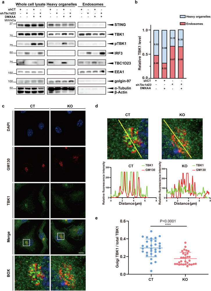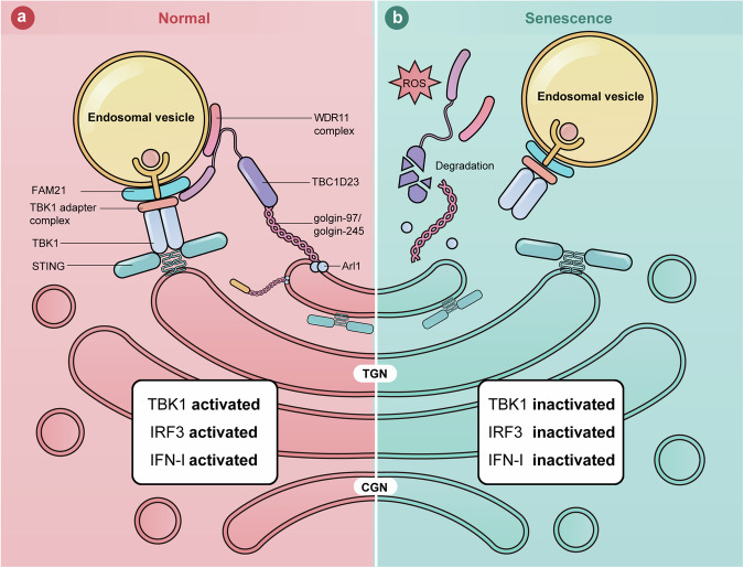 The cGAS-STING pathway mediates the innate immune response to cytosolic DNA, contributing to surveillance against microbial invasion or cellular damage. Once activated, STING recruits TBK1 at the trans-Golgi network (TGN), which in turn phosphorylates IRF3 to induce type I interferon (IFN-I) expression. In contrast to STING, little is known about how TBK1 is transported to the TGN for activation. Here, we show that multiple TGN tethering factors, a group of proteins involved in vesicle capturing, are indispensable for STING-IFN-I signaling. Deletion of TBC1D23, a recently reported tethering factor, in mice impairs the STING-IFN-I signaling, but with insignificant effect on STING-NF-κB signaling. Mechanistically, TBC1D23 interacts with TBK1 via the WASH complex subunit FAM21 and promotes its endosome-to-TGN translocation. Furthermore, multiple TGN tethering factors were reduced in aged mice and senescent fibroblasts. In summary, our study uncovers that TGN tethering factors are key regulators of the STING-IFN-I signaling and suggests that their reduction in senescence may produce aberrant STING signaling.