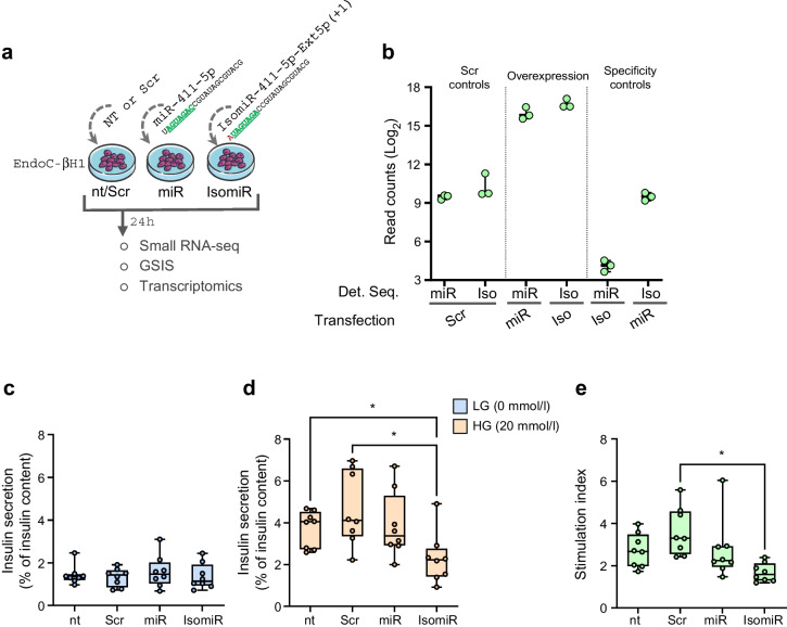 Results: IsomiRs constituted 59.2 ± 1.9% (LCM-HI), 59.6 ± 2.4% (CI-HI), 42.3 ± 7.2% (sorted beta cells) and 43.8 ± 1.2% (EndoC-βH1) of total miRNA reads (data represented as mean ± SD), with 3' end trimming (Trim3p) being the predominant modification. A beta cell-specific isomiR signature of 30 sequences was identified, with isomiR-411-5p-Ext5p(+1) showing a significant inverse correlation with basal insulin secretion (p=0.0009, partial R2=0.68) and total insulin secretion (p=0.005, partial R2=0.54). Overexpression of isomiR-411-5p-Ext5p(+1), but not of its canonical counterpart, importantly reduced GSIS by 51% ( ± 15.2%; mean ± SD) (p=0.01) in EndoC-βH1 cells. Transcriptomic analysis performed in EndoC-βH1 cells and CI-HI identified 47 genes significantly downregulated by isomiR-411-5p-Ext5p(+1) (false discovery rate [FDR]<0.05) but not by the canonical miRNA, with enriched pathways related to Golgi vesicle biogenesis (FDR=0.017) and trans-Golgi vesicle budding (FDR=0.018). TargetScan analysis confirmed seed sequence-dependent target specificity for 81 genes uniquely regulated by the isomiR (p=1.1 × 10⁻⁹).