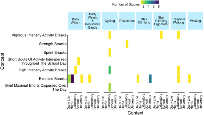Conclusion: The 'exercise snack' concept is being increasingly used to cover an array of exercise models. The most common protocols to date utilize body weight exercises or stair climbing. We recommend 'exercise snacks' terminology is consistently used to describe protocols whereby short, purposeful structured exercise is dispersed throughout the day. Future studies should provide detailed descriptions of their 'exercise snacks' model, through exercise and adverse event reporting checklists.