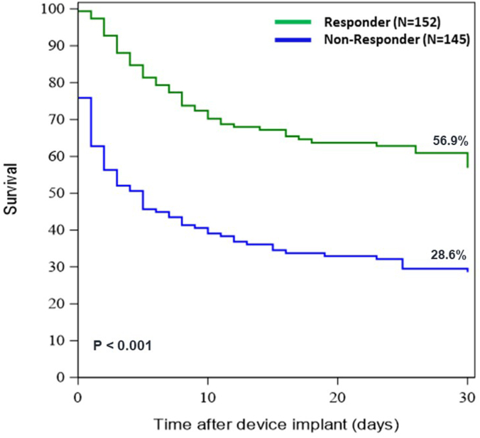 Results: Of the 415 RECOVER III patients, 298 presented in stage E shock; 152 (51.1%) were responders and 145 (48.8%) were nonresponders. Kaplan-Meier 30-day survival estimates were 56.9% and 28.6% in responders and nonresponders, respectively (P < .001). In multivariate analysis, fewer inotropic medications during Impella support (P < .0001), more lesions treated (P = .01), Impella support initiated pre-PCI (P = .03), and baseline white blood cell (P = .048) were all significant predictors for responsiveness to therapy.