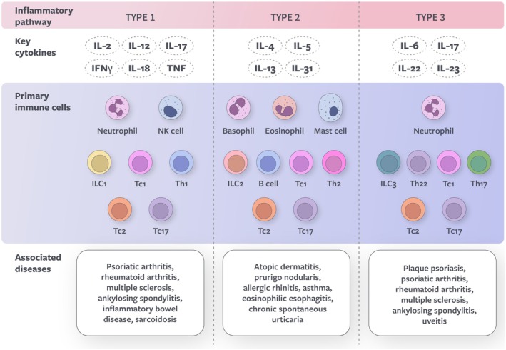 Atopic dermatitis, prurigo nodularis, and chronic spontaneous urticaria are immune-mediated, inflammatory skin conditions characterized by intense itch and disease-specific skin lesions. Despite their different clinical presentations, the three diseases are unified by an aberrant type 2 immune response involving type 2 cytokines, immune cells, and sensory nerves that may underlie their shared clinical manifestations of inflammation and pruritus. The chronic nature of these conditions is associated with significant impairment in patients' quality of life and psychological disorders, such as anxiety and depression. This article reviews type 2 inflammation and its role in atopic dermatitis, prurigo nodularis, and chronic spontaneous urticaria, focusing on the pathophysiologic drivers of type 2 inflammation in each dermatologic condition. Understanding the shared immune mechanisms that underlie these seemingly distinct skin diseases and other concomitant inflammatory conditions is critical for applying therapeutic interventions targeting the type 2 immune pathway.