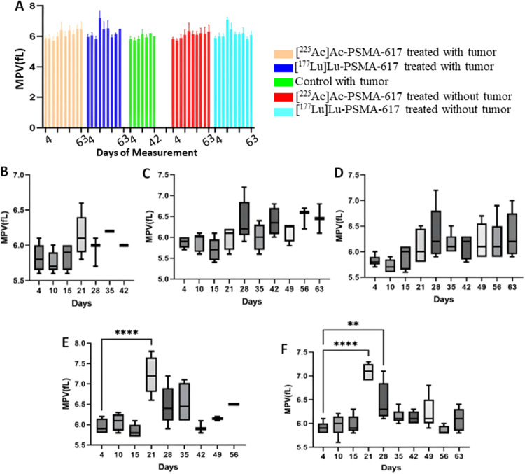 Method: Twenty-five male C57BL/6 mice were inoculated with RM1-PGLS cells and monitored using [68Ga]Ga-PSMA-11 PET/CT. The mice were divided into five groups as follows: (1) [225Ac]Ac-PSMA-617 treatment with tumors, (2) [177Lu]Lu-PSMA-617 treatment with tumors, (3) control group with tumors, (4) [225Ac]Ac-PSMA-617 treatment without tumors, and (5) [177Lu]Lu-PSMA-617 treatment without tumors. Tumor volume was measured weekly, and animals were sacrificed when tumors reached 1.5 cm³. Endpoint criteria included tumor size, survival, and body mass. Blood samples were collected at different time points to assess blood cell counts and liver and kidney function.