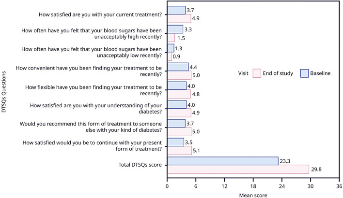 Results: Of 445 eligible participants, 398 completed the study; 351 (78.9%) remained on oral semaglutide at EoS. The median time of treatment follow-up was 40 weeks for each participant. At baseline, participants had a mean (standard deviation [SD]) age of 62.9 (10.2) years, HbA1c of 7.8% (1.3), T2D duration of 8.0 (6.9) years, and BW of 87.8 (19.0) kg. The estimated changes (95% confidence interval) from baseline to EoS in HbA1c and BW were - 0.9%-points (- 1.01 to - 0.82; p < 0.0001) and - 3.8 kg (- 4.45 to - 3.24; p < 0.0001), respectively. At EoS, 65.1% achieved HbA1c < 7%; 25.5% and 19.1% reached HbA1c reduction ≥ 1%-point plus ≥ 3% and ≥ 5% reduction in BW, respectively. DTSQ status improved significantly at EoS (estimated change + 5.24; 95% CI, 5.24 to 6.61, p < 0.0001). Of participants who remained on oral semaglutide at EoS, 72.6% received a 7-mg dose. No new safety signals were observed.
