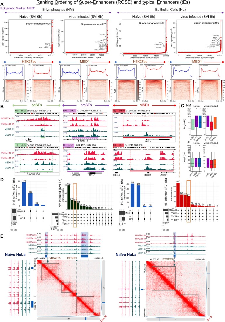 Human health depends on perplexing defensive cellular responses against microbial pathogens like Viruses. Despite the major effort undertaken, the (epi)genomic mechanisms that human cells utilize to tailor defensive gene expression programs against microbial attacks have remained inadequately understood, mainly due to a significant lack of recording of the in vivo functional cis-regulatory modules (CRMs) of the human genome. Here, we introduce the virus-responsive fate of the human (epi)genome as characterized in naïve and infected cells by functional genomics, computational biology, DNA evolution, and DNA Grammar and Syntax investigations. We discovered that multitudes of novel functional virus-responsive CRMs (vrCRMs) compose typical enhancers (tEs), super-enhancers (SEs), repetitive-DNA enhancers (rDEs), and stand-alone functional genomic stretches that grant human cells regulatory underpinnings for layering basal immunity and eliminating illogical/harmful defensive responses under homeostasis, yet stimulating virus-responsive genes and transposable elements (TEs) upon infection. Moreover, extensive epigenomic reprogramming of previously unknown SE landscapes marks the transition from naïve to antiviral human cell states and involves the functions of the antimicrobial transcription factors (TFs), including interferon response factor 3 (IRF3) and nuclear factor-κB (NF-κB), as well as coactivators and transcriptional apparatus, along with intensive modifications/alterations in histone marks and chromatin accessibility. Considering the polyphyletic evolutionary fingerprints of the composite DNA sequences of the vrCRMs assessed by TFs-STARR-seq, ranging from the animal to microbial kingdoms, the conserved features of antimicrobial TFs and chromatin complexes, and their pluripotent stimulus-induced activation, these findings shed light on how mammalian (epi)genomes evolved their functions to interpret the exogenous stress inflicted and program defensive transcriptional responses against microbial agents. Crucially, many known human short variants, e.g. single-nucleotide polymorphisms (SNPs), insertions, deletions etc., and quantitative trait loci (QTLs) linked to autoimmune diseases, such as multiple sclerosis (MS), systemic lupus erythematosus (SLE), Crohn's disease (CD) etc., were mapped within or vastly proximal (±2.5 kb) to the novel in vivo functional SEs and vrCRMs discovered, thus underscoring the impact of their (mal)functions on human physiology and disease development. Hence, we delved into the virus-responsive fate of the human (epi)genome and illuminated its architecture, function, evolutionary origins, and its significance for cellular homeostasis. These results allow us to chart the "Human hyper-Atlas of virus-infection", an integrated "molecular in silico" encyclopedia situated in the UCSC Genome Browser that benefits our mechanistic understanding of human infectious/(auto)immune diseases development and can facilitate the generation of in vivo preclinical animal models, drug design, and evolution of therapeutic applications.