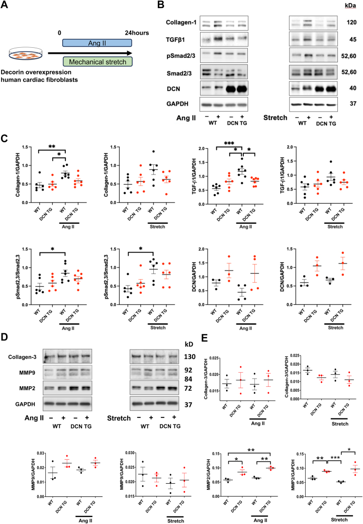 Right ventricular (RV) pressure loading induces RV profibrotic signaling and fibrosis associated with RV dysfunction. RV decorin protein levels are decreased in patients with chronic RV pressure loading. RV decorin protein levels are also decreased in 4 animal models of mechanical RV pressure loading and pulmonary arterial hypertension. Human cardiac fibroblasts overexpressing decorin show diminished collagen-1 secretion in response to mechanical or chemical profibrotic stress while decorin knockout human cardiac fibroblasts show increased collagen-1 secretion in response to stress. Downregulation of decorin may play a key role in upregulating transforming growth factor-β1 profibrotic signaling and fibrosis that contribute to RV dysfunction in RV pressure loading.