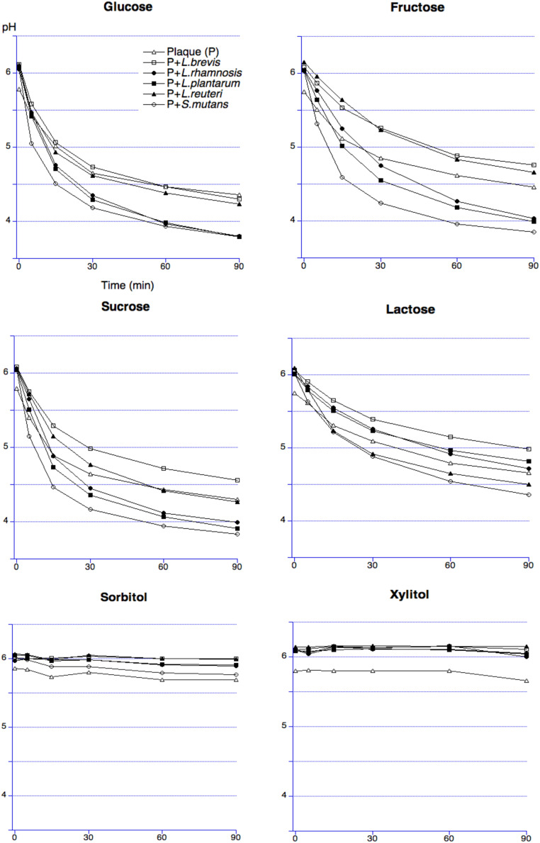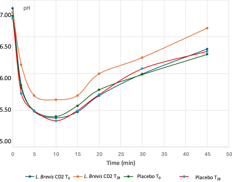 Methods: L. brevis CD2 and several control strains (Lactobacillus brevis CD2, Lactobacillus reuteri DSM 17938, Lactobacillus rhamnosus LB21, Lactobacillus plantarum 931, Streptococcus mutans Ingbritt) were tested with various sugars; pH changes were recorded at specific time points using a micro-pH electrode. Additionally, for the ex vivo phase, the same sugars were added to equal amounts of pooled plaque from 9 healthy subjects with bacterial suspensions, as well as a control solution, and pH was monitored for up to 90 minutes. For the ex vivo phase, 9 adults were randomised in a crossover design for 28 days. For the in vivo phase, 26 healthy subjects used 1/2 lozenges 3 times daily containing either L. brevis CD2 (active) or no probiotic bacteria (placebo). Plaque acidogenicity was assessed using the microtouch method after a 10 ml mouth rinse containing 10% sucrose for 1 minute (on day 0 and day 28).