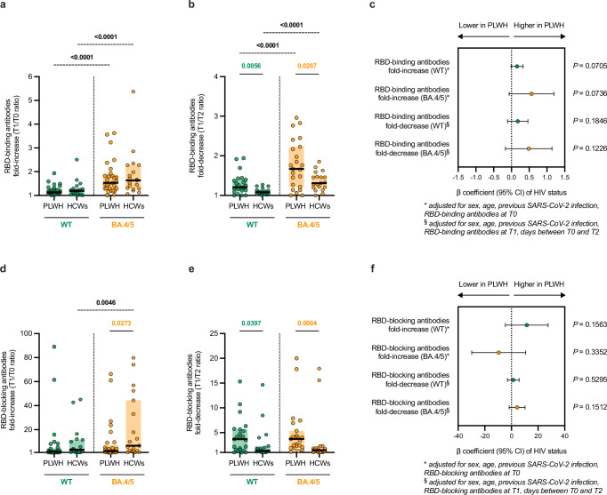 Methods: In this prospective longitudinal study, PLWH receiving either an original-BA.4/5 bivalent booster or an original monovalent booster and HIV-negative healthcare workers (HCWs) receiving a bivalent booster were enrolled and sampled before (T0), 1 month (T1), and 4-9 months (T2) after the vaccine administration. SARS-CoV-2-specific T and B cells, RBD-binding antibodies, and RBD-blocking antibodies against both wild type (WT) and omicron BA.4/5 virus were determined.