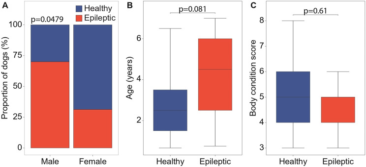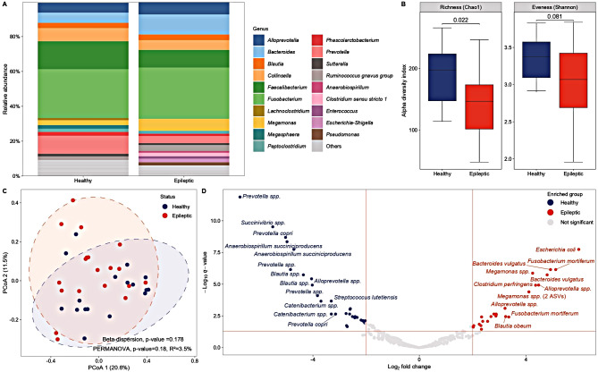 Results: No significant differences were observed between the two groups regarding age, breed, body condition score, diet, or reproductive status, though males were significantly overrepresented in the idiopathic epileptic group. Epileptic dogs showed a marked reduction in bacterial richness and a trend towards lower evenness (α-diversity) compared to healthy controls, while no differences in community composition (β-diversity) were observed between the two groups. Moreover, a decrease in SCFA-producing bacteria, namely Faecalibacterium, Prevotella, and Blautia, was observed alongside an increase in Escherichia coli, Clostridium perfringens, and Bacteroides in epileptic dogs.