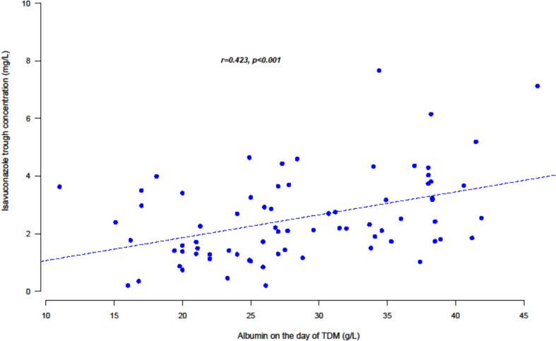 Results: Most of the included patients (n = 102) were admitted into haematology units (41.1% [n = 42]) or intensive care units (ICU) (30.4% [n = 31]). Aspergillosis (47.0% [n = 48]), mucormycosis (25.6% [n = 26]), and off-label empirical treatments (18.6% [n = 19]), were the three most common indications. About half of the patients (46.1% [n = 47]) had an optimal exposure, while 42.2% (n = 43) were underexposed, and 11.7% (n = 12) were overexposed. Albumin level on the day of TDM was a significant factor associated with an increase in isavuconazole Cmin (p = 0.010). Among the 11 patients who had liver test abnormalities, isavuconazole was discontinued in six (n = 6) patients and liver injury was attributable to isavuconazole in two (n = 2) patients.