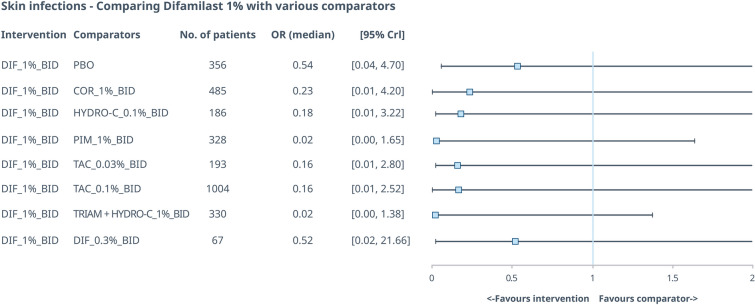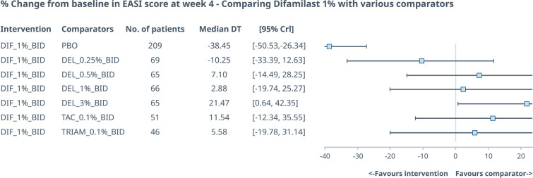 Results: A total of 11 randomised controlled trials (RCTs) conducted in adult patients with varying degrees of AD severity were selected for NMA. The systematic review showed improvement in EASI scores with difamilast 0.3% and 1% and tacrolimus 0.1% as well as in IGA score success rates with difamilast 1%, delgocitinib 3%, and tacrolimus 0.1%. According to NMA, at week 4, difamilast 1% twice daily (BID) showed a significant improvement in the IGA score and percent EASI score change from baseline versus placebo; however, compared to other comparators, point estimates numerically favoured difamilast 1% but were not statistically significant. Difamilast 1% BID showed a significantly lower incidence of acne than delgocitinib 0.3% BID. There was no statistically significant difference in the incidence of serious AEs, acne, and skin infections compared to placebo or other comparators.