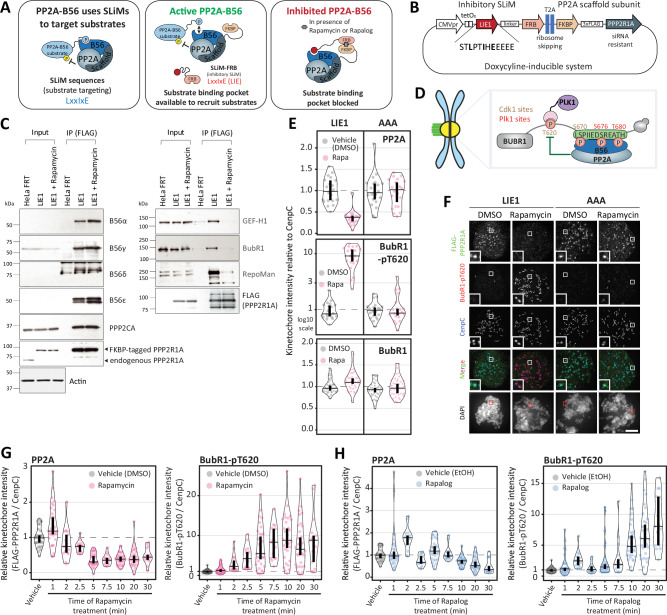 Serine-threonine phosphatases have been challenging to study because of the lack of specific inhibitors. Their catalytic domains are druggable, but these are shared or very similar between individual phosphatase complexes, precluding their specific inhibition. Instead, phosphatase complexes often achieve specificity by interacting with short linear motifs (SLiMs) in substrates or their binding partners. We develop here a chemical-genetic system to rapidly inhibit these interactions within the PP2A-B56 family. Drug-inducible recruitment of ectopic SLiMs ("directSLiMs") is used to rapidly block the SLiM-binding pocket on the B56 regulatory subunit, thereby displacing endogenous interactors and inhibiting PP2A-B56 activity within seconds. We use this system to characterise PP2A-B56 substrates during mitosis and to identify a role for PP2A-B56 in allowing metaphase kinetochores to properly sense tension and maintain microtubule attachments. The directSLiMs approach can be used to inhibit any other phosphatase, enzyme or protein that uses a critical SLiM-binding interface, providing a powerful strategy to inhibit and characterise proteins once considered "undruggable".