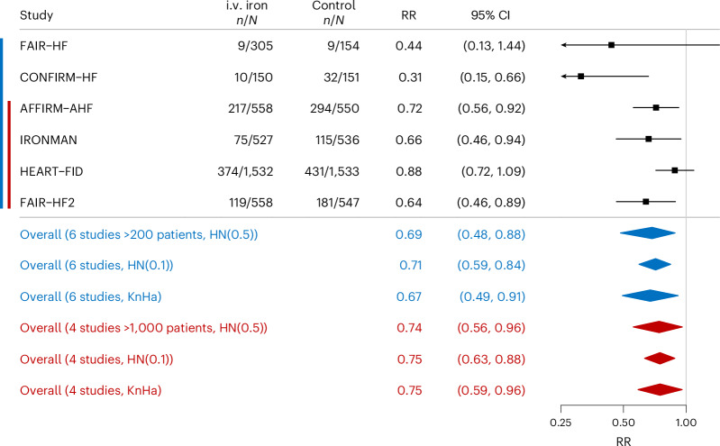 Uncertainty remains about the effect of intravenous (i.v.) iron on outcomes for heart failure (HF) with iron deficiency. In the present study, we summarize the efficacy and safety of i.v. iron from six trials (FAIR-HF, CONFIRM-HF, AFFIRM-AHF, IRONMAN, HEART-FID and FAIR-HF2), including 7,175 patients. In comparison to prior analyses, this meta-analysis added new data from FAIR-HF2, used a harmonized and robust Bayesian approach and included individual participant data from five trials. Patients assigned to i.v. iron, compared with those assigned to placebo, had lower rates for the composite endpoint of recurrent HF hospitalizations and cardiovascular mortality at 12 months (risk ratio (RR) = 0.72 (95% confidence interval (CI) = 0.55-0.89)) and for the complete length of follow-up (RR = 0.81 (95% CI = 0.63-0.97)). Each component of the primary endpoint contributed to the beneficial effect of i.v. iron at both 12 months and the complete length of follow-up: recurrent HF hospitalizations (RR = 0.69 (95% CI = 0.48-0.88) and RR = 0.78 (95% CI = 0.55-0.98), respectively) and cardiovascular mortality (hazard ratio (HR) = 0.80 (95% CI = 0.61-1.03) and HR = 0.87 (95% CI = 0.73-1.04), respectively). All-cause mortality at 12 months and for the complete length of follow-up (HR = 0.82 (95% CI = 0.65-1.03)) and HR = 0.92 (95% CI = 0.80-1.07), respectively, indicated the overall safety of i.v. iron treatment. Treatment effects were greatest in the first year after randomization when the doses of i.v. iron provided are highest. These findings suggest that treating iron deficiency in patients with HF significantly reduces cardiovascular events and also suggests further investigation of optimal dosing of i.v. iron.