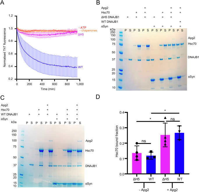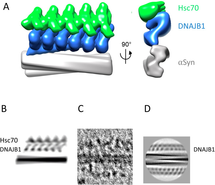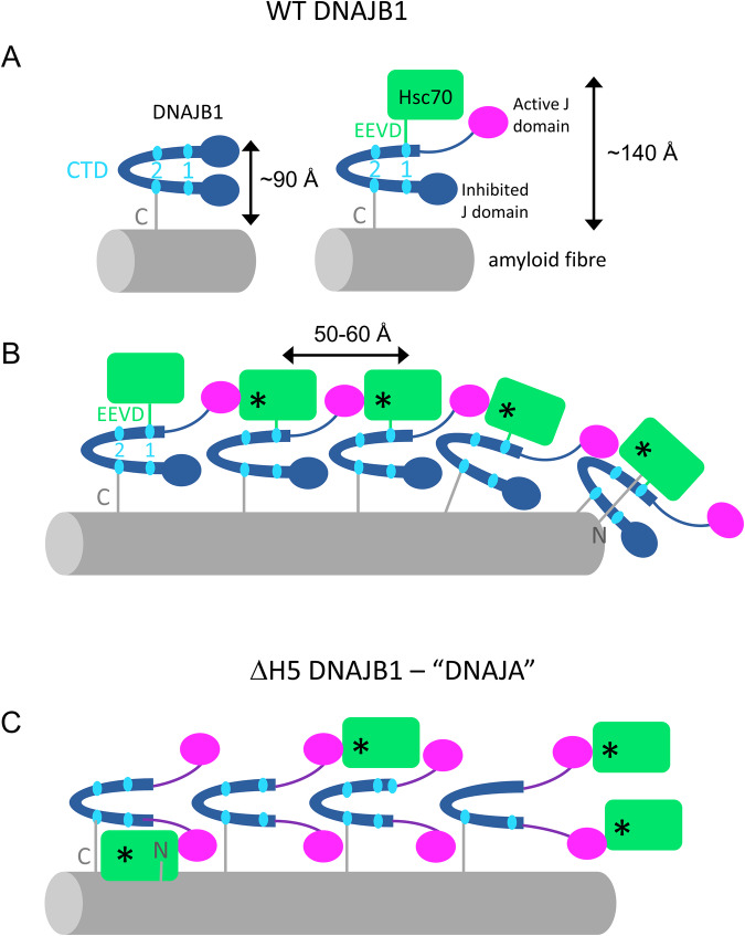 The Hsp70 chaperone system is capable of disassembling pathological aggregates such as amyloid fibres associated with serious degenerative diseases. Here we examine the role of the J-domain protein co-factor in amyloid disaggregation by the Hsc70 system. We used cryo-EM and tomography to compare the assemblies with wild-type DNAJB1 or inactive mutants. We show that DNAJB1 binds regularly along α-synuclein amyloid fibrils and acts in a 2-step recruitment of Hsc70, releasing DNAJB1 auto-inhibition before activating Hsc70 ATPase. The wild-type DNAJB1:Hsc70:Apg2 complex forms dense arrays of chaperones on the fibrils, with Hsc70 on the outer surface. When the auto-inhibition is removed by mutating DNAJB1 (ΔH5 DNAJB1), Hsc70 is recruited to the fibrils at a similar level, but the ΔH5 DNAJB1:Ηsc70:Apg2 complex is inactive, binds less regularly to the fibrils and lacks the ordered clusters. Therefore, we propose that 2-step activation of DNAJB1 regulates the ordered assembly of Hsc70 on the fibril. The localised, dense packing of chaperones could trigger a cascade of recruitment and activation to give coordinated, sequential binding and disaggregation from an exposed fibril end, as previously observed in AFM videos. This mechanism is likely to be important in maintaining a healthy cellular proteome into old age.