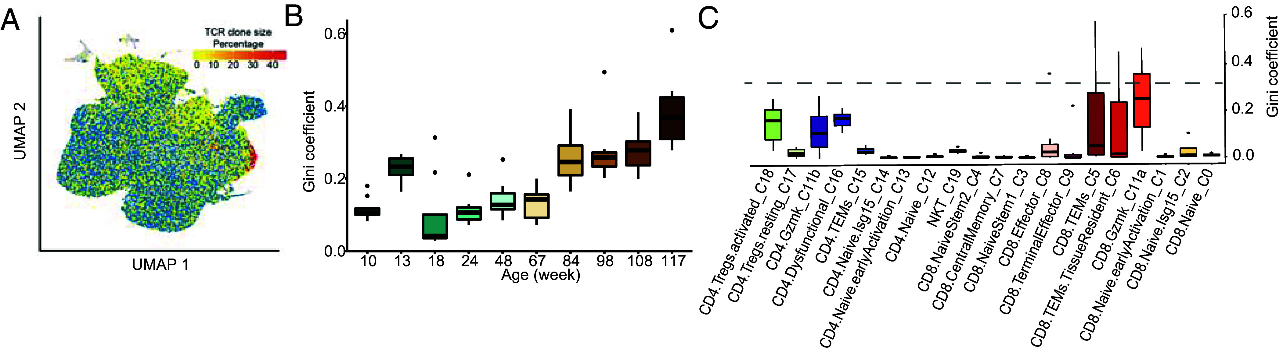 Keywords: T cells; aging; aging gene signature; granzyme K; single-cell RNA.