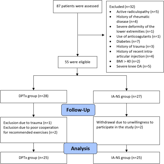 Results: Overall, 55 patients were included in the study, but 50 completed the study process (25 patients in each treatment arm). The mean age of patients with knee OA was 62.98 ± 5.37, ranging from 55 to 74 years. We observed significant improvement in both groups in terms of knee pain, function, and knee extension degree at all follow-up visits (p < 0.001). Although DPTx was associated with better results than IA-NS, the difference was not statistically significant (p > 0.05). The adverse events were limited to injection-site pain and ecchymosis, which resolved by week 4.