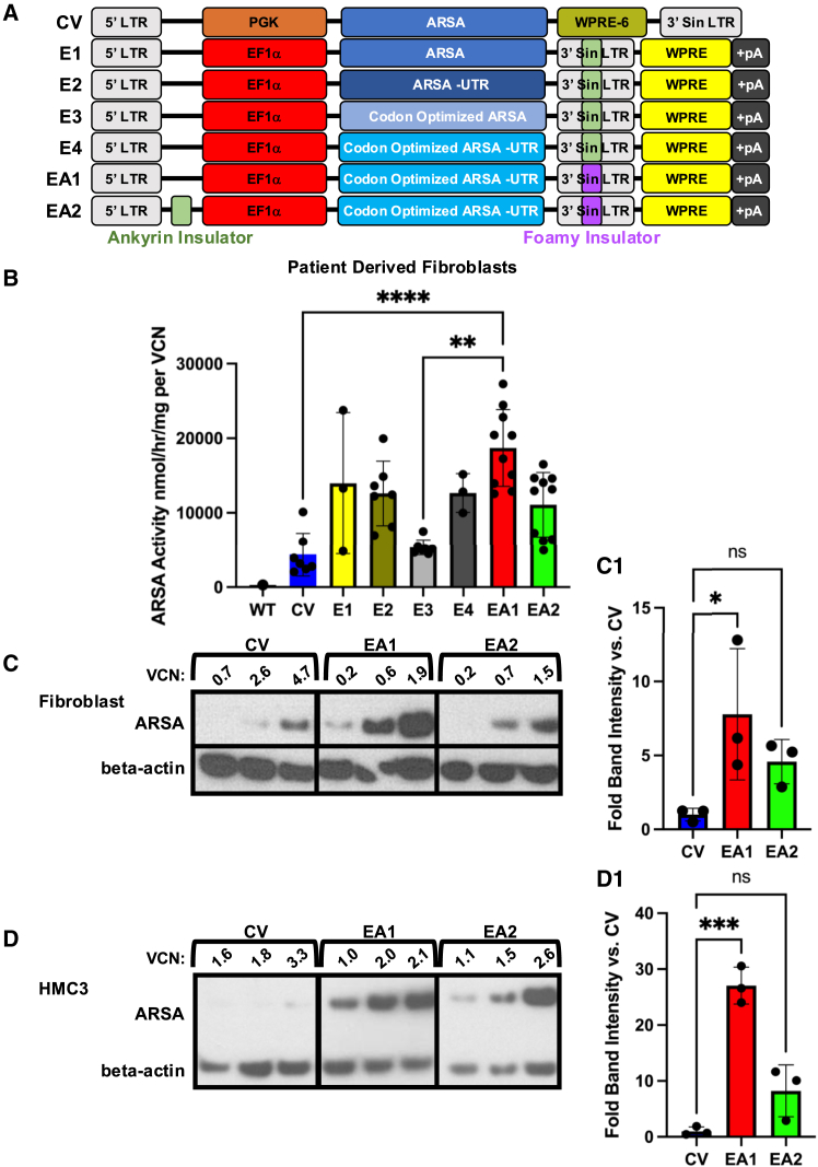 Metachromatic leukodystrophy (MLD) is a fatal lysosomal storage disease characterized by the deficient enzymatic activity of arylsulfatase A (ARSA). Combined autologous hematopoietic stem cell transplantion (HSCT) with lentiviral (LV)-based gene therapy has great potential to treat MLD. Achieving the optimal balance between high enzyme production for therapeutic efficacy and maintaining a low vector copy number (VCN) is crucial. Insufficient enzyme levels can lead to the progression of motor symptoms, undermining treatment goals. Conversely, elevated VCN increases the risk of genotoxicity, which poses safety concerns, and contributes to higher production costs, making the therapy less accessible. Striking this balance is essential to maximize clinical benefit while minimizing risks and costs. To address this need, we increased the expression of ARSA cDNA at single integration by generating novel LVs, optimizing ARSA expression and enhancing safety. In addition, our vectors achieved optimal transduction in mouse and human hematopoietic stem cells (HSCs) with minimal multiplicity of infection (MOI). Our top-performing vector (EA1) showed at least 4× more ARSA activity than the currently US and European Union (EU)-approved vector and a superior ability to secrete vesicle-associated ARSA, a critical modality to transfer functional enzymes from microglia to oligodendrocytes. Three-month-old Arsa-knockout (KO) MLD mice transplanted with Arsa-KO bone marrow (BM) cells transduced with 0.6 VCN of EA1 demonstrated behavior and CNS histology matching wild-type (WT) mice. Our novel vector boosts efficacy while improving safety as a robust approach for treating MLD patients.