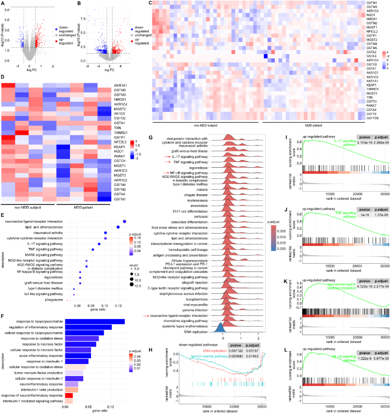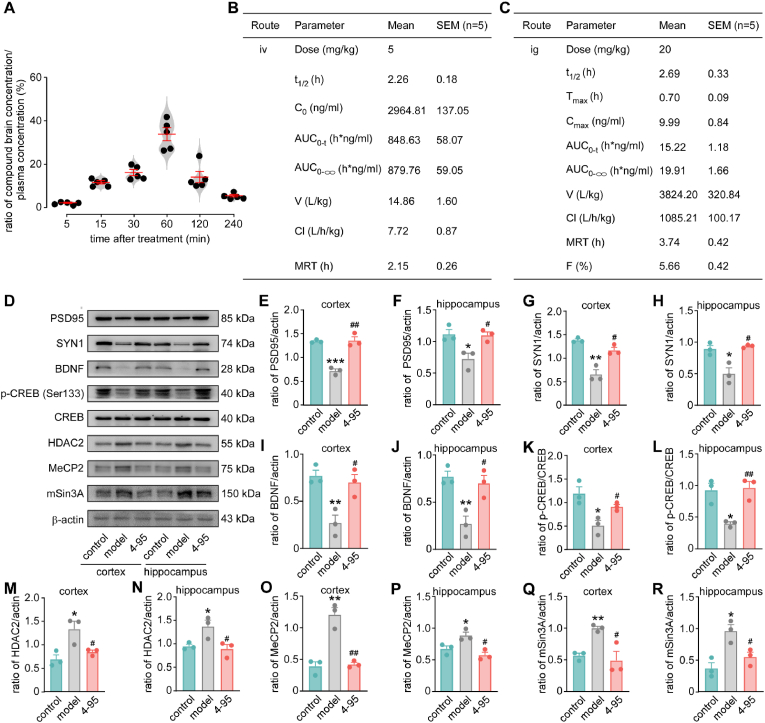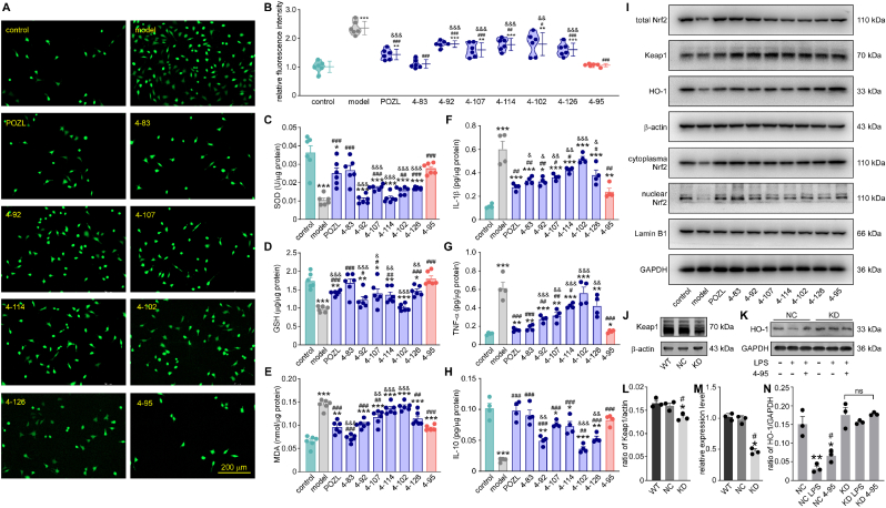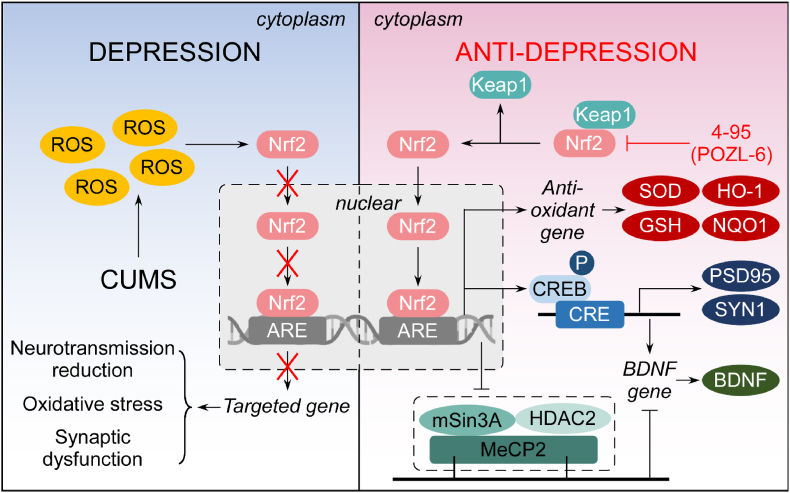 Inhibiting the protein-protein interaction (PPI) between Keap1 and Nrf2 is theoretically an effective and safe strategy for activation of Nrf2 pathway to treat major depressive disorder (MDD). In this study, through bioinformatic analysis of the brain tissues and peripheral blood of MDD patients and depressive mice, we confirmed the involvement of oxidative stress, inflammation, and the Keap1-Nrf2 pathway in depression. Subsequently, we developed a series of phosphodiester amino acidic diaminonaphthalene compounds as Keap1-Nrf2 PPI inhibitors for the first time. Screening using the LPS-stimulated SH-SY5Y and BV2 cell models identified compound 4-95 showing the best anti-oxidative stress and anti-inflammatory efficacy. The ability of 4-95 to penetrate the blood-brain-barrier was significantly enhanced. In a chronic unpredictable mild stress mouse model, treatment with 4-95 effectively ameliorated anxiety and depression behavior and restored serum neurotransmitter levels by promoting the Nrf2 nuclear translocation. Consequently, oxidative stress was reduced, and the expression of synaptic plasticity biomarkers, such as postsynaptic density protein 95 (PSD95) and synapsin 1 (SYN1) were significantly increased, suggesting the recovery of neuronal function. Collectively, our findings demonstrate that the Keap1-Nrf2 PPI inhibitor holds great promise as a preclinical candidate for the treatment of depression.