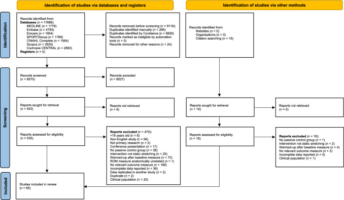 Methods: Seven databases (CINAHL Complete, Cochrane CENTRAL, Embase, Emcare, MEDLINE, Scopus and SPORTDiscus) were systematically searched up to 6 June, 2024. Randomised and non-randomised controlled trials investigating the effects of acute (single session) or chronic (two or more sessions) SS on muscle-tendon unit structure (fascicle length), mechanical properties (stiffness) or stretch tolerance (maximum tolerable passive resistive torque) compared to non-stretching passive controls (adults aged ≥ 18 years) were included. The effects of SS were examined using a multi-level meta-analysis, with associations between changes in maximum tolerable passive resistive torque, stiffness and fascicle length with improvements in ROM examined using multivariate meta-regression.