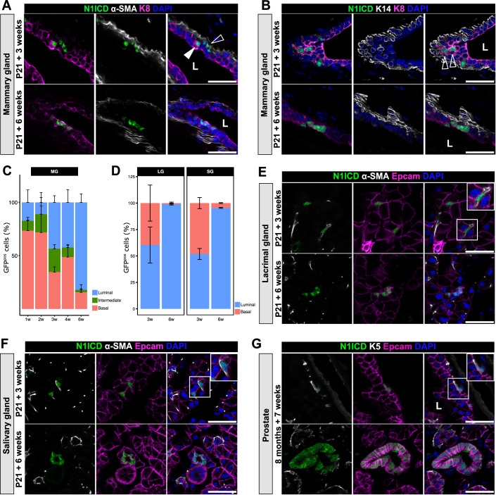 The mammary epithelium derives from multipotent mammary stem cells (MaSCs) that engage into differentiation during embryonic development. However, adult MaSCs maintain the ability to reactivate multipotency in non-physiological contexts. We previously reported that Notch1 activation in committed basal cells triggers a basal-to-luminal cell fate switch in the mouse mammary gland. Here, we report conservation of this mechanism and found that in addition to the mammary gland, constitutive Notch1 signaling induces a basal-to-luminal cell fate switch in adult cells of the lacrimal gland, the salivary gland, and the prostate. Since the lineage transition is progressive in time, we performed single-cell transcriptomic analysis on index-sorted mammary cells at different stages of lineage conversion, generating a temporal map of changes in cell identity. Combining single-cell analyses with organoid assays, we demonstrate that cell proliferation is indispensable for this lineage conversion. We also reveal the individual transcriptional landscapes underlying the cellular plasticity switching of committed mammary cells in vivo with spatial and temporal resolution. Given the roles of Notch signaling in cancer, these results may help to better understand the mechanisms that drive cellular transformation.