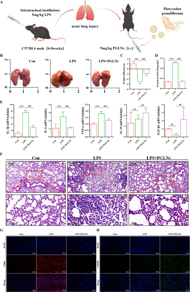 Conclusion: Fresh PG has better anti-inflammatory and repair effects than its dried form. As one of the most effective active substances in fresh PG, PGLNs may regulate macrophage inflammation and polarization by regulating metabolic pathways including lipid metabolism and glycolysis, so as to reduce inflammation and repair lung injury.