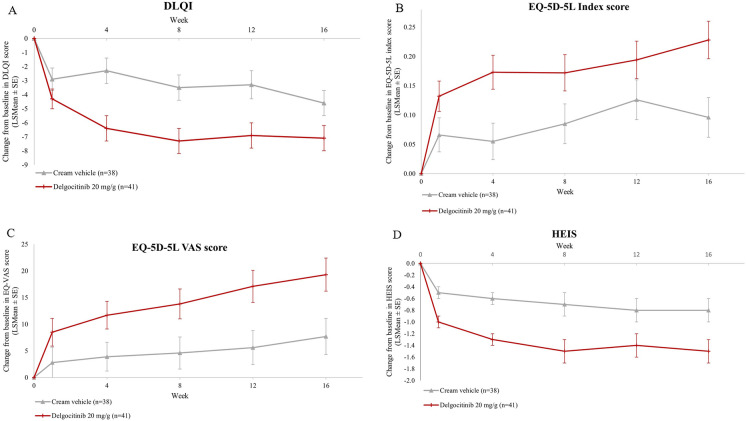 Results: At screening, mean (SD) DLQI, EQ-5D-5L, and HEIS were 8.1 (5.8), 0.788 (0.175), and 1.7 (0.8), respectively for mild CHE (n = 93), and 12.1 (6.9), 0.689 (0.236), and 2.3 (0.9) for participants with moderate to severe CHE (n = 202), respectively. Among the participants with moderate to severe CHE who received delgocitinib (n = 41), the least squares mean [SE] change from baseline to week 16 improved compared to cream vehicle (n = 38) in DLQI (- 7.1 [0.9] vs. - 4.6 [0.9]), EQ-5D-5L (0.228 [0.032] vs. 0.096 [0.034]), and HEIS (- 1.5 [0.2] vs. - 0.8 [0.2]) (P < 0.05).
