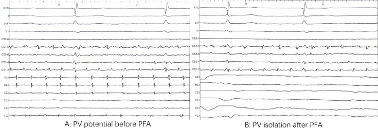 Methods: Patients with AF underwent TEEP under general anaesthesia with the guidance of three-dimensional (3D) transoesophageal echocardiography (TEE) throughout the procedure. After a successful transseptal puncture, the PFA catheter (CardiPulse) was delivered to the different pulmonary veins sequentially for standard PFA, and the pulmonary vein electrical isolation (PVI) was observed in real-time. After the ablation, left atrial bipolar voltage mapping under sinus rhythm was performed to verify the PVI.